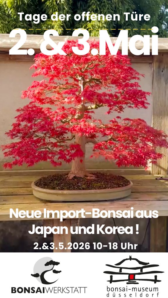 30. Januar 202602. & 03.Mai 2026 – 10-17 Uhr: Am ersten Mai-Wochenende freuen wir uns Sie zu den Tagen der offenen Türe in der Bonsai-Werkstatt und dem Bonsai-Museum Düsseldorf einzuladen. Es erwarten Sie zahlreiche neue Bäume aus Japan, Korea und Europa, ein erweitertes Angebot an Schalen und Zubehör und viel gute Laune. Für das leibliche Wohl ist mit gesorgt. Genießen Sie mit uns diese besonders schöne Zeit im Bonsai-Jahr, wir freuen uns auf Sie.